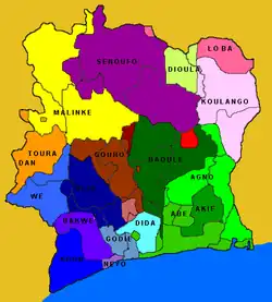 - ↑ a b Gabriel Rougerie, L’Encyclopédie générale de la Côte d’Ivoire: le milieu et l’histoire, Nouvelles éditions africaines, Abidjan, Paris, 1978, ISBN 2-7236-0542-6, S. 426