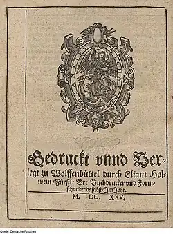 - ↑ a b Christoph Reske: Elias Holwein (Hollwein) 1636–1639. In: Ders.: Die Buchdrucker des 16. und 17. Jahrhunderts im deutschen Sprachgebiet. Auf der Grundlage des gleichnamigen Werkes von Josef Benzing (= Beiträge zum Buch- und Bibliothekswesen, Band 51). Harrassowitz, Wiesbaden 2007, ISBN 978-3-447-05450-8 und ISBN 3-447-05450-6, S. 352 ff.; books.google.de über Google-Bücher