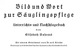 Unterdessen war 1928, ebenfalls bei Teubner, Behrends Schrift Bild und Wort zur Säuglingspflege erschienen, laut dem Untertitel ein „Unterrichts- und Nachschlagebuch,“ in dem wiederum ein Geleitwort des hannoverschen Kinderfacharztes Wilhelm Riehn vorangestellt war.[8] Wie auch ihr älterer Titel wurde das Werk in der Zeitschrift Arbeiterwohlfahrt 1928 rezensiert.[9] Eine mit 32 Seiten für den Gebrauch an Schulen gekürzte Auflage erschien in zweiter Auflage im Jahr 1936.[2] Das insgesamt ausführlichere und gründlichere Nachschlagwerk erschien in der Nachkriegszeit 1949 als 8., völlig neu bearbeitete Auflage bei Schmorl & von Seefeld in Hannover.[10]