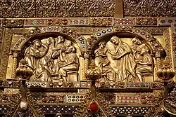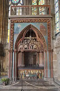 Aus etwa dem gleichen Zeitraum stammt eine Steinskulptur im Naumburger Dom, die Elisabeth mit einem Buch in der Hand darstellt. Diese Statue wird gelegentlich als noch älter als die Darstellungen des Elisabeth-Schreines und die Glasfenster der Elisabethkirche eingestuft.[93] Bildzyklen zum Leben Elisabeths befinden sich auch im vor 1350 entstandenen Krumauer Bildercodex, der in der Österreichischen Nationalbibliothek in Wien aufbewahrt wird, sowie auf den 23 etwa um 1420 bis 1430 entstandenen Eichenholztafeln, die die Brüstung des Sängerchores im Heiligen-Geist-Hospital in Lübeck zieren.[92][94]