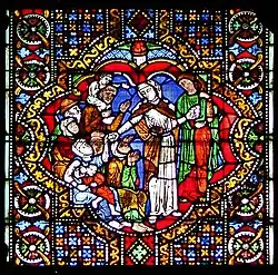 Die Marburger Elisabethkirche gilt zusammen mit der Liebfrauenkirche in Trier als erster gotischer Bau Deutschlands. Sie ist eine der wenigen Kirchen des 12. und 13. Jahrhunderts, deren ursprüngliche Farbverglasung wenigstens teilweise erhalten blieb. Die zwölf Darstellungen auf den Kirchenfenstern, die Elisabeth von Thüringen unter anderem zeigen, wie sie Gefangene besucht, Kranke pflegt, Heimatlosen Obdach gewährt, Hungrige speist und Almosen spendet, gelten zusammen mit dem achtteiligen Reliefzyklus auf dem Schrein als die vermutlich ältesten Darstellungen Elisabeths in der bildenden Kunst. Elisabeths Tochter Sophie stiftete 1240 den Schrein, in dem ihre Gebeine über drei Jahrhunderte aufbewahrt wurden; die Glasfenster sind vermutlich etwas jünger. Glasfenster und Elisabethschrein zeigen ausschließlich Szenen, die durch zeitgenössische Quellen belegt sind.[92] Zu den Höhepunkten des Reliefzyklus zählt die Abschiedsszene zwischen Elisabeth und Ludwig von Thüringen, die einander ein letztes Mal umarmen. Elisabeth ist auf diesem Relief nicht als junge Frau dargestellt, sondern mit dem Antlitz einer von Schmerz und Leid gekennzeichneten Greisin.