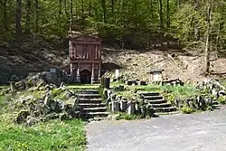 An meine Mündung ein Steinbecken und festes Gebäude,
