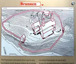 Nach dem Tod und der Heiligsprechung der Elisabeth erhielten die Franziskaner die Möglichkeit, dicht oberhalb der Quelle und des Hospitals eine bescheidene Klosteranlage aufzubauen.[3] Damit sollte der Hospitalbetrieb weiterhin ermöglicht werden und zugleich erhoffte man sich, hier einen Wallfahrtsort zu schaffen. Das Kloster bestand von 1331 bis 1525 und besaß neben einer Kirche auch mehrere Wirtschaftsgebäude. Die Anlage wurde mit einer Umfassungsmauer geschützt, die auch das Brunnenhaus und das Hospital mit einbezog. Nach dem Abzug der Franziskaner 1525 als Folge des auch im Eisenacher Gebiet auflodernden Bauernaufstandes wurde das Kloster aufgegeben, die Bauten dienten als wohlfeiles Baumaterial und Lagerplatz. Gleichzeitig muss auch der Hospitalbetrieb zum Erliegen gekommen sein, da die erforderlichen Abgaben und Spenden mit der Säkularisation des Klosters fortan ausblieben.[4]