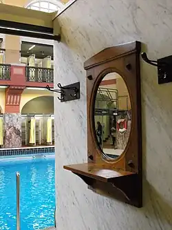 Im Eingangsbereich befindet sich ein Aesculap-Brunnen mit der Inschrift: „Jugendbrunnens Zauberkraft ist nicht bloße Sage, Jugendfrische gibt das Bad zaubernd alle Tage“. Auf Grund der zeitgenössisch üblichen Geschlechtertrennung besitzt das Bad zwei Schwimmhallen. Die kleine Halle mit einem Schwimmbecken von 17,5 m × 8 m (150 m²) war ursprünglich den Frauen vorbehalten. Blickfang ist der von Fritz Klimsch entworfene Brunnen mit dem Relief „Badende Frauen“, das in der Königlichen Porzellan-Manufaktur Berlin gefertigt wurde. Das 27,5 m × 12,5 m (340 m²) große Schwimmbecken der großen Halle, die ursprünglich den Männern vorbehalten war, ist mit einem Neptunbrunnen geschmückt, der nach einem Modell des Bildhauers Carl Burger gefertigt wurde. In beiden Hallen stehen den Badegästen auf zwei Ebenen geräumige Umkleide-Einzelkabinen zur Verfügung. Die ursprünglich als Thermalbad konzipierte Elisabethhalle besaß früher auch ein Dusch- und Wannenbad, ein römisch-irisches Schwitzbad und ein Hundebad.