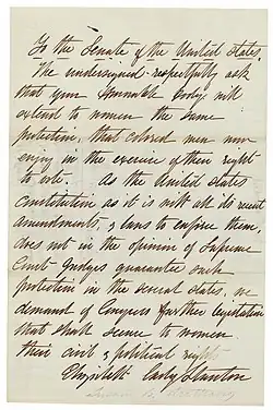 Thaddeus Stevens, ein republikanischer Kongressmann aus Pennsylvania und glühender Abolitionist, war auch der Meinung, dass das Wahlrecht universell sein sollte. 1866 entwarfen Stanton, Anthony und einige andere Suffragistinnen eine Wahlrechts-Petition, die forderte, dass das Wahlrecht ohne Ansehen des Geschlechts oder der Rasse gewährt werden sollte. Die Petition wurde durch Stevens dem Kongress der Vereinigten Staaten vorgelegt.[36] Trotz dieser Bemühungen wurde das 14. Amendment 1868 ohne Anpassung verabschiedet.