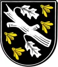 Blasonierung: „In Schwarz ein schrägrechts liegender silberner (weißer) Eichenstamm mit zwei Ästen und zwei Blättern, oben und unten begleitet von je zwei schrägrechten gestümmelten goldenen (gelben) Bienen.“ |