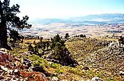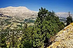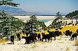 Die Vegetation der Elmalı-Region wurde vom niederländischen Archäobotaniker W. van Zeist der Oro-mediterranen Vegetationsstufe zugeordnet und als von alpiner Vegetation umgeben beschrieben. Da die Elmali Ovası selbst weitgehend landwirtschaftlich genutzt wird und somit kaum mehr Merkmale natürlicher Vegetation aufweist, liegen die vegetationsgeographischen und landschaftsprägenden Aspekte mehr im umgebenden Hügel- und Bergland der Region, die vor allem wegen ihrer noch stattlichen Zedernwälder bekannt ist.[56] Innerhalb der oberen Waldzone von 1200–2000 m finden sich hauptsächlich Nadelwälder aus Pinuss nigra (Schwarzkiefer bis 1800 m Höhe), Cedrus libani (Libanesische Zeder/Sedir), Abies cilicia (Kilikische Tanne/Köknar) und Juniperus excelsa (Griechischer Wacholder/Boylu Ardıç). Südöstlich des Avlan Gölü und südlich von Elmalı gibt es ausgedehnte Zedern- und Tannenwälder sowie Wacholder-Zedern-Wälder. Zu den Strauchschichten dort gehören Quercus calliprinos (Palästina-Eiche) bzw. Quercus coccifera (Kermes-Eiche oder Stech-Eiche, Kermes meşesi), Juniperus oxycedrus (Stechwacholder/Katran Ardici), Heckenkirsche (Lonicera xylosteum/Hanımeli), Berberitze (Berberis vulgaris/Karamuk), Terpentin-Pistazie/Terebinthe (Pistacia terebinthus/Menengiç). Als Degenerationsstadium von Zedern-Wacholderwäldern findet man im gleichen Gebiet die Strauchvegetation lichter Wacholder-Eichenwälder aus Griechischem Wacholder und Kermes-Eiche. Die Zedern-Wacholder-Wälder in der Nähe des Avlan Gölü kommen in einer Höhe von bis zu 1050 Metern vor. Die dichten Wälder von Cedrus Libani waren in der Vergangenheit wie auch heute eine wichtige Lebensgrundlage für die Bewohner der Ebene und wurden in der Antike vor allem im Schiffbau, in der Hausarchitektur, für Möbel und zum Heizen genutzt.[57] Reiseberichte aus der Mitte des 19. Jh. erwähnen auch die umfangreiche Nutzung von Zedernholz in Elmalı zu Heizzwecken[58] und als Exportgut u. a. nach Ägypten.[59] Gegenwärtig gibt es im Gewerbe- und Industrieviertel (Organize Sanayi Bölgesi) von Elmalı einen großen Bereich mit Tischlereien, die sich mit der Verarbeitung von Zedernholz befassen. Seine Nutzung ist in begrenzten Mengen auf Möbelbau und Luxusartikel beschränkt. Wachstum und Nutzung der Zedern werden vom Forstamt in Elmalı streng kontrolliert.[60][56]