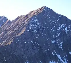 Von der Mittleren Kreuzspitze (2496 m) nach Norden stellenweise etwas ausgesetzt, aber versichert hinab zum tiefsten Punkt (ca. 2370 m) und auf dem Grat wieder hinauf zum Gipfel. Der Übergang dauert etwa eine halbe Stunde.