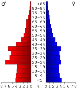 28,0 Prozent der Bevölkerung waren unter 18 Jahre alt, 13,9 Prozent zwischen 18 und 24 Jahre, 36,0 Prozent zwischen 25 und 44 Jahre, 15,0 Prozent zwischen 45 und 64 Jahre. 7,1 Prozent waren 65 Jahre oder älter. Das Durchschnittsalter betrug 29 Jahre. Auf 100 weibliche Personen kamen 123,2 männliche Personen. Auf 100 Frauen im Alter von 18 Jahren und darüber kamen 130,6 Männer.