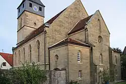 Im Ortskern befindet sich die evangelische Kirche, an der man mit der Spätromanik und der Gotik zwei Stilrichtungen erkennen kann.[6] Die Kirche wurde im 12. Jahrhundert romanisch erbaut. Der Turm wurde 1588 gotisch erhöht. Das Kirchenschiff wurde 1881 wegen Baufälligkeit abgebrochen und durch einen neugotischen Neubau ersetzt. Ein Seitenportal ist mit der Jahreszahl 1881 bezeichnet.[7]
