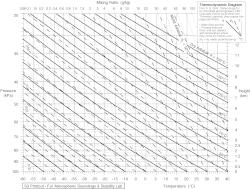 Die horizontale Achse (X-Achse) beschreibt jeweils die Temperatur in Grad Celsius und die vertikale Achse (Y-Achse) die Höhe in Metern und hPa. Da Temperatur und Feuchtigkeitsgehalt bei diesem Diagrammtyp vertikal dargestellt sind, werden die Hilfslinien (Linien gleicher Temperatur oder Isotherme) der Temperaturachse (X-Achse) um 45 Grad nach rechts geneigt dargestellt[1]. Weil unter normalen Verhältnissen die Luft in der Troposphäre mit zunehmender Höhe kälter wird (ca. 0.65 K/100m bei 100 % relativer Luftfeuchtigkeit (feuchtadiabatisch) und ca. 1K/100m unter 100 % relativer Luftfeuchtigkeit (trockenadiabatisch)) und die Neigung etwa dieser Abnahme entspricht, verläuft ein eingetragenes Temperaturprofil näherungsweise vertikal.