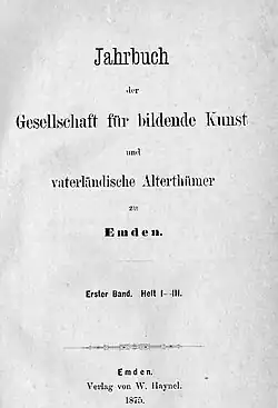 1820 gründeten sechs Emder Bürger einen Kunstverein, der seit 1823 unter seinem heutigen Namen Gesellschaft für bildende Kunst und vaterländische Altertümer zu Emden (kurz: Emder Kunst, in lokalen Medien zuweilen auch einfach die Kunst) firmiert. In den 1860er Jahren organisierte der Verein Vorträge zur Geschichte Ostfrieslands. Diese trafen auf ein großes Interesse, so dass ab 1870 eine regelmäßige Reihe organisiert wurde. 1872 gab der Verein daraufhin unter dem Titel Jahrbuch der Gesellschaft für bildende Kunst und vaterländische Altertümer zu Emden erstmals ein Jahrbuch heraus und veröffentlichte darin die Ergebnisse der historischen und landeskundlichen Forschung Ostfrieslands. Die zweite Ausgabe erschien 1875. Ab 1881 erschien die Zeitschrift bis zum Ende des Ersten Weltkrieges nahezu jährlich in Heften. Die Wirtschaftskrise und die damit einhergehende Inflation führten ab den 1920er Jahren zu einer sehr unregelmäßigen Erscheinungsweise. Die Gesellschaft veröffentlichte ihre Jahrbücher in dieser Zeit lediglich 1920, 1925 und ab 1927 in Bänden. Auf dem Höhepunkt der Wirtschaftskrise konnte der 23. Band im Jahre 1932 nur mit Hilfe einer Spende aus der Schweiz erscheinen. Zur Zeit des Nationalsozialismus erschien die Zeitschrift von 1936 bis 1939 sowie 1942 jährlich unter der Schirmherrschaft des nationalsozialistischen Regierungspräsidenten Refardt.