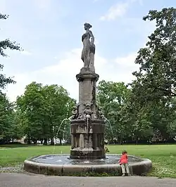Auf der Brunnensäule erhebt sich die fast nackte römische Göttin Juno mit einem Pfau. An der Säulenbasis sind 4 Putten angeordnet, die auf wasserspeienden Delphinen reiten. Die Putten halten eine Meeresschnecke, eine Getreidegarbe, einen Obstkorb und Weintrauben in den Händen als Symbolde von Fischerei, Ackerbau, Obst- und Weinbau. Literatur: #Chronik 1910, #Wais 1954.1, Seite 62. → Weitere Abbildungen. |