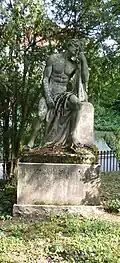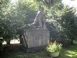 Grabmal für den Fabrikanten Otto Bayer († 1917). Steinfigur einer sitzenden, fast unbekleideten Figur eines männlichen Trauernden. |