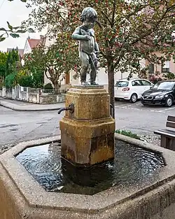 Brunnenbüblebrunnen mit der Bronzefigur eines nackten Buben auf dem Brunnenstock, Spitzname Männeken Pis. Literatur: #Petzold 1989, Seite 61–62. |