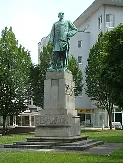 Bismarckdenkmal mit einer 4,20 Meter hohen Bronzefigur Bismarcks. Guss: Paul Stotz. → Weitere Abbildungen. | |