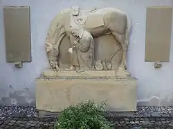 Denkmal für die Gefallenen des Ersten Weltkriegs aus Kernen an der St.-Veits-Kirche in dem Ortsteil Stetten. Standbild aus Sandstein „Betender Krieger“ eines knienden, betenden Soldaten vor seinem grasenden Pferd. |