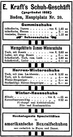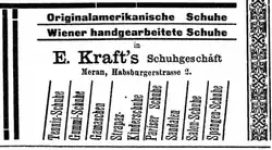 - ↑ Schuhgeschäft Emil Kraft im „Krafthaus“, Hauptplatz 20; 1909 abgetragen wegen Erweiterung der Frauengasse, Betrieb in die Pfarrgasse 2 verlegt. – Böheimer: Straßen & Gassen. S. 34.
