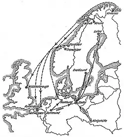 - ↑ Martin Koch: Die Vogelfluglinie. Eine europäische Fährverbindung. Geschichte, Verkehrsentwicklung, Verkehrserwartungen, Lübeck 1979, Schriftreihe der Industrie- und Handelskammer zu Lübeck, Nr. 11, S. 18.