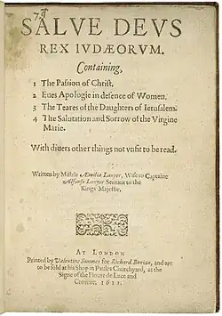 Emilia Lanier (geboren 1569 als Aemilia Bassano; gestorben 1645[1]) war eine englische Dichterin. Ihr Werk Salve Deus rex Judaeorum (1611), eine Sammlung religiöser Verse, war die erste Gedichtveröffentlichung durch eine Frau im siebzehnten Jahrhundert.