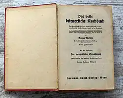 - Das beste bürgerliche Kochbuch vorzüglich für das Haus berechnet. Ein Handbuch für jede Hausfrau und Köchin, unentbehrlich für Anfängerinnen in der Kochkunst. Nebst Speisekalender auf alle Tage, Productentabelle für alle Monate. Hermann Kanitz Verlag, Gera 1886.
