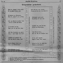 Bereits nach Einführung des Typendrucktelegraphen durch David Edward Hughes verwendeten einige stilisierte Gesichter aus den vorhandenen Typen, wie die hier abgebildete Telegraphische Zeichenkunst (veröffentlicht in der Deutschen Postzeitung, VII. Jg.(Nr. 22), 16. November 1896, S. 497) verdeutlicht.[8]