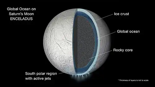 Gravimetrische Messungen deuten darauf hin, dass sich nicht nur unter dem Eis der Südpolregion ein Ozean aus Wasser befindet, sondern ein globaler extraterrestrischer Ozean existiert. Dazu wurden Vorbeiflüge von Cassini genutzt und ausgewertet. Die Massenverteilung im Inneren des Mondes beeinflusst die Flugbahn der Sonde, was über die Dopplerverschiebung ihrer Funksignale vermessen werden kann. Außerdem wurde die Libration der Mondoberfläche vermessen. Ein Wasserozean führt dazu, dass die Eiskruste sich unabhängig vom Kern drehen kann, was besser zu den Messwerten passt als eine feste Verbindung mit dem Kern.[30][31] Damit wurde die Schale höherer Dichte und geringerer Festigkeit entdeckt, die als ein Wasserozean mit einer Tiefe von 10 km unter 30 bis 40 km Eis interpretiert wird.[32][33][34][35]
