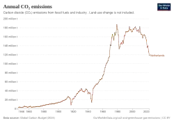 Die Volksrepublik China ist vor den USA der größte Energiekonsument und seit 2006 der größte Verursacher von Treibhausgasen weltweit. Im Jahr 2013 entfiel auf China 22,4 % der globalen Energienachfrage und 27 % der weltweiten Kohlendioxid-Emissionen.[112] Im Jahr 2018 waren es bereits 29,7 % der weltweiten Kohlendioxid-Emissionen.[113]