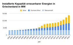 Der Anteil von Wind, Photovoltaik, Biomasse und Mini-Wasserkraft an der Gesamtstromerzeugung hat in den vergangenen Jahren zugenommen und machte im Jahr 2020 9,5 Prozent aus. Das offizielle Ziel ist, bis 2025 mindestens 20 Prozent zu erreichen.[18] Die installierte Kapazität erneuerbarer Energie lag 2021 bei 10,4 GW Wasserkraft, 3,3 GW Onshore-Wind und 1,1 GW an Solarenergie.[12] Während Solarenergie mit 1,5 % der Stromerzeugung weiter nur eine kleine Rolle spielte, stammten bereits 8,7 % des erzeugten Stroms aus Windenergie.[19]