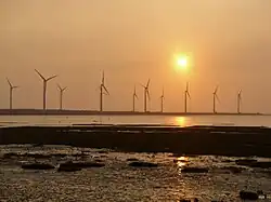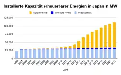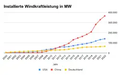 Onshore-Wind wächst stark und 2022 waren bereits mehr als 24 Gigawatt an Kapazität am Netz.[6] Stand April 2023 ist noch kein Offshore-Windpark in Betrieb. Die technisch mögliche Offshore-Kapazität allein mit festinstallierten Anlagen in Wassertiefen bis 50 m wird auf 480[102] bzw. bis zu 700 GW geschätzt.[100]