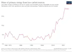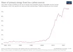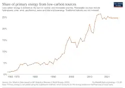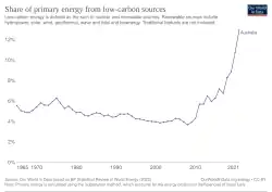 Australiens Primärenergiebedarf wird von fossilen Energieträgern dominiert. 2021 stammten 33,9 % der im Land verbrauchten Energie aus Erdöl, 28,6 % aus Kohle und 24,9 % aus Erdgas; erneuerbare Energien hatten einen Anteil von knapp 13 %, eine Verdopplung gegenüber 2017.[35] Australien ist zugleich ein großer Exporteur von Energieträgern wie Kohle, LNG und Uran. Etwa 2/3 der geförderten Energieträger wurden 2019 exportiert.[36] Unter anderem stammten knapp 30 % der weltweit gehandelten Kohle und mehr als 20 % des Erdgases aus Australien; ein weiterer Ausbau war Stand 2019 geplant.[37] Im Jahr 2020 stammten 75,5 % der verbrauchten Primärenergie aus fossilen Quellen gegenüber 89,5 % im Jahr 1990.[38]