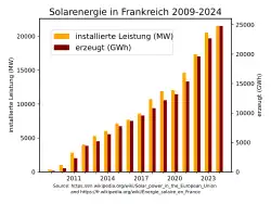 An Photovoltaik-Leistung waren Ende 2014 3.105 MWp vorhanden. Dies entsprach ca. 277 W/Einwohner und war der dritthöchste Wert in der EU nach Deutschland und Italien.[75] Die installierte Photovoltaikleistung stieg bis Ende 2020 auf 4.788 MW[65] und bis Ende 2023 auf 8.750 MW.[76] 2021 trug Photovoltaik 5,1 % zur belgischen Stromproduktion bei.[67]