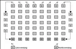 Bei diesem Verfahren stellten sich die Schützen in geschlossenen Reihen bis zu zehn Mann hintereinander und bis zu zehn Mann nebeneinander auf, der Abstand zur benachbarten Abteilung betrug jeweils fast 2 m. Die Vordermänner der Reihen gingen bei Kampfbeginn ein kleines Stück nach vorne und feuerten ihre Arkebusen oder Musketen ab. Anschließend marschierten sie außen durch die Gassen nach hinten, während die zweiten in der Reihenfolge in die Feuerstellung gingen und alle anderen nachrückten. Dann stellten sich die zweiten hinten an, und die dritten feuerten, und so weiter. Wenn alle einmal geschossen hatten, hatten die ersten Schützen im Normalfall genug Zeit gehabt, ihren Vorderlader wieder schussbereit zu machen.