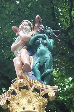 Das achteckige Becken besteht aus Steinplatten, die durch ein oberes Eisenzugband zusammengehalten werden. Der Brunnenstock aus der Zeit der Renaissance besteht aus zwei Steinen und kommt möglicherweise ohne innere Röhren aus. Auf dem bemerkenswerten Kapitell befindet sich eine Figurengruppe, die aus einem Stück gefertigt wurde. Neben dem Teufel sitzt ein Engel, der ein Lamm schützend umarmt. Der Stock und die Figuren sind in den Komplementärfarben Rot/Grün und in Blau/Gold gefasst.[1]
