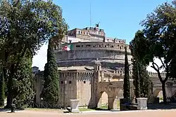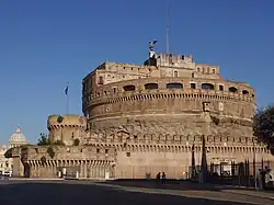 Der heutige Name der Anlage ist einer Legende entlehnt, die aus der berühmten Hagiographiensammlung Legenda aurea des Dominikaners Jacobus de Voragine aus dem 13. Jahrhundert stammt. Im Jahr 590, als Rom die Justinianische Pest erreichte, organisierte Papst Gregor I. der Große eine Bußprozession der römischen Bevölkerung, die in sieben Zügen zur heutigen Santa Maria Maggiore zog. Der Legende entsprechend soll den Teilnehmern über dem Grabmal Hadrians (das aus diesem Grund heute Engelsburg genannt wird) Erzengel Michael erschienen sein, der ihnen das Ende der Pest verkündete, indem er das Schwert des göttlichen Zorns in die Scheide steckte.[2] In der Realität fand die Pest mit der Bußprozession jedoch nicht ihr Ende, 13 Jahre später wurde die Prozession – offenbar aus gegebenem Anlass – wiederholt. Letztmals ist ein Ausbruch der Justinianischen Pest in Rom für das Jahr 722 bezeugt.[3] Die Prozessionsteilnehmer gelangten tatsächlich nicht einmal in die Nähe des Hadrian-Mausoleums.[4] Jedoch erinnert heute noch die Statue des Engels auf der Spitze des Gebäudes an jene legendarische Darstellung. Von 1577 bis 1752 stand dort oben ein von Raffaello da Montelupo geschaffener Engel aus Marmor, der heute im Innenhof, dem Cortile dell’Angelo, zu sehen ist. Dieser wurde 1752 durch die heutige, von Peter Anton von Verschaffelt entworfene Figur aus Bronze ersetzt.[5] Außerdem wurde dem Erzengel eine um 610 von Papst Bonifatius IV. eingebaute Kapelle gewidmet.
