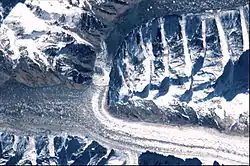 Die charakteristische Biegung des Gletschers mit dem Merzbacher-See nach dessen Ausbruch.