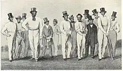 Die erste heute bekannte Mannschaft, mit dem Anspruch „England“ zu repräsentieren, war ein „All-England“ Team, das am 9. Juli 1739 gegen eine starke Mannschaft aus der „unbesiegbaren Grafschaft“ Kent knapp verlor.[3] In den folgenden Jahrzehnten folgten noch viele Spiele ähnlicher Art, bis 1846 William Clarke eine „All-England Eleven“ ins Leben rief.[4] Gegen die unter anderem von John Wisden im Jahr 1852 gegründete „United All-England Eleven“[5] fanden zwischen 1857 und 1866 jährliche Spiele statt, die damals der Höhepunkt der englischen Cricket-Saison waren, auch was die Qualität der Spieler betraf.