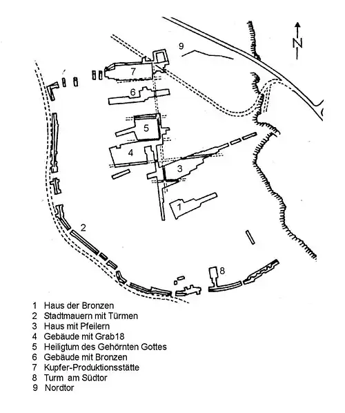 Die Stadt war seit etwa 1200 v. Chr. von einer Mauer umgeben. Das Fundament bestand aus großen Steinen (zyklopisches Mauerwerk), darauf stand die eigentliche Mauer aus Lehmziegeln. Eine ähnliche Konstruktion findet sich in Palaiokastro in Westzypern. Die rechtwinkligen Straßen sind auf die Stadttore orientiert. An kommunalen Anlagen ist eine ausgefeilte Kanalisation hervorzuheben.