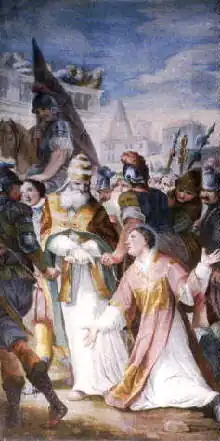 Der heilige Lorenz begleitet Papst Sixtus II. zum Märtyrertod, Fresko, Pfarrkirche Zogno, ca. 1773
