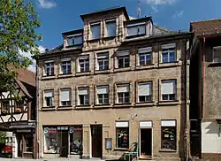 - Waagstraße 5 – Mehrteilige Baugruppe: dreigeschossiges Wohnhaus, teils verputzt, teils Fachwerk verschiefert, 18. Jh., Mansarddach von 1890; nördlich im rechten Winkel anschließend zweigeschossiger Neurenaissance-Eckbau, 1889 von Johann Michael Horneber; davor freistehend parallel zum älteren Flügel Sandstein-Vorbau mit Portal und Laden, 1889.