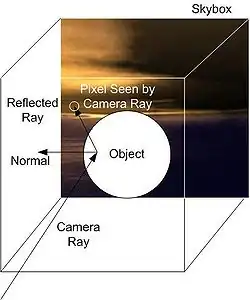 Dabei wird die Umgebung des spiegelnden Objekts als Textur gespeichert und auf die Oberfläche des Objekts abgebildet (mapping). Die am häufigsten gebrauchten Arten, um die umgebende Textur zu speichern, sind das sphärische und das kubische Environment Mapping. Bei ersterem wird die Textur, die die Umgebung darstellt, auf das Innere einer Kugel abgebildet, während bei zweiterem die Umgebung auf die sechs Seiten eines Würfels „aufgefaltet“ wird. Der Vorteil von Environment Mapping gegenüber Raytracing ist die einfachere und damit schnellere Berechnung der simulierten Reflexionen. Der große Nachteil dieser Technik ist, dass die zu spiegelnde Umgebung bereits vor dem Rendern des Objekts bekannt sein muss und somit sich ändernde Umgebungen bzw. Selbstreflexionen nicht einfach umzusetzen sind.