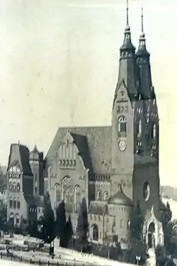 Im Südwesten wurde ein zweigeschossiger Anbau errichtet, in dem sich u. a. die Sakristei befand. Der Mauerwerksbau ist mit roten Ziegeln und braunen Terrakottafliesen verblendet, der Sockel und das Portal, das sich an der Turmfront befindet, sind aus Natursteinmauerwerk. Der Portalvorbau besteht aus einer kielbogenüberfangenen Rundbogennische, darüber eine kleine Fensterrose, die Glockenstube hat rundbogige Schallöffnungen. Die quadratischen Turmenden mit geschweiften Giebeln und steilen polygonalen Helmen sind mit barocken Hauben bekrönt. Die Giebel des Querschiffes sind verziert. Über dem Hauptgesims befindet sich eine spitzbogige Attika.