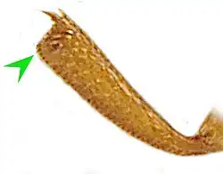 Das neunte Hinterleibssegment trägt auf der Oberseite ein Paar nach hinten und schräg nach oben abstehende zapfenartige Anhänge (Urogomphi), davor liegt ein Paar halb so lange, in gleicher Richtung weisende Tuberkel.[10]