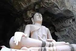 Auch der Felsen mit der Erawan-Höhle und der Höhleneingang etwa auf halber Gipfelhöhe – bewacht von einer monumentalen sitzenden Buddhafigur – ist in dieser Landschaft bereits von weitem zu sehen. Die Bergkuppe mag wie ein kniender Elefant aussehen, und die Seite mit dem Höhleneingang wie die Stirn eines Elefanten – vielleicht ein Grund dafür, dass hier dem mythologischen Elefanten Erawan mit der Namensgebung der Höhle Reverenz erwiesen wird. Die Höhle wird von den Einheimischen auch Tham Chang (in Thai: ถ้ำ ช้าง, Elefantenhöhle) genannt.