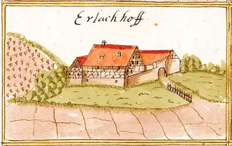 ![]() Ansicht von Erbachhof aus den Forstlagerbüchern von Andreas Kieser