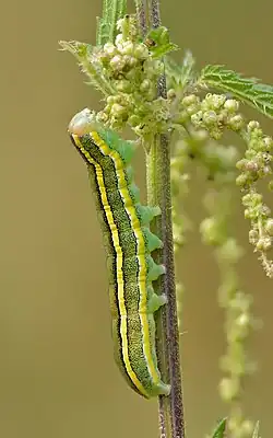 Die Raupen können in grünen oder rotbraunen Formen auftreten. Eine Rückenlinie fehlt, dagegen sind die breiten hellgelben Nebenrückenlinien und Seitenstreifen sehr auffällig. Der Kopf ist gelblichbraun bis gelblichgrün[5].[3] Ausgewachsen werden sie bis 45 mm lang.[6]