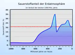 Der Sauerstoff O2 spielt die Hauptrolle bei der weiteren Entwicklung zur heutigen Atmosphäre. Cyanobakterien mit oxygener Photosynthese führten als C-Autotrophe zu einem weiteren Absinken der Kohlenstoffdioxidkonzentration, bildeten aber vor allem (möglicherweise schon vor etwa 3,5 Milliarden Jahren beginnend) Sauerstoff. Die Sauerstoffkonzentration der Atmosphäre blieb jedoch zunächst gering, weil der gebildete Sauerstoff in den Ozeanen bei der Oxidation von Eisen(II)-Ionen und Schwefelwasserstoff verbraucht wurde. Erst vor etwa zwei Milliarden Jahren begann Sauerstoff in die Atmosphäre zu entweichen, als die mit Sauerstoff reagierenden Stoffe knapp wurden. Vor einer Milliarde Jahren überstieg die Sauerstoffkonzentration der Atmosphäre drei Prozent, wodurch sich im Verlauf der nächsten 400 Millionen Jahre allmählich eine erste Ozonschicht bilden konnte. Vor 500–600 Millionen Jahren stieg der Sauerstoffgehalt, bedingt durch das erste massenhafte Auftreten von Landpflanzen, rapide an und erreichte vor 350 Millionen Jahren erstmals das heutige Niveau. Nach mehreren starken Schwankungen während des Erdmittelalters erreichte der Luftsauerstoffgehalt schließlich den heutigen Wert von 21 %.