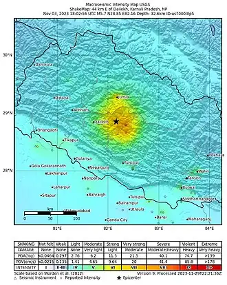 Das Erdbeben vom 3. November 2023 hatte sein Epizentrum im Distrikt Jajarkot rund 330 Kilometer westnordwestlich der nepalesischen Hauptstadt Kathmandu. Von verschiedenen Erdbebenwarten wurden voneinander ungewöhnlich stark abweichende Magnituden ermittelt: Laut dem staatlichen seismologischen Institut Nepals (NEMRC) betrug die Magnitude 6,4 ML,[5] die indische Erdbebenwarte (NCS) gibt ebenfalls eine nicht näher spezifizierte Magnitude von 6,4 an.[6] Dagegen ermittelte das United States Geological Survey (USGS) eine Momenten-Magnitude von 5,7 MW[7] und das Deutsche GeoForschungsZentrum (GFZ) eine Momenten-Magnitude von 5,8 MW.[8] Eine Herdtiefe wurde vom NEMRC nicht veröffentlicht, USGS gibt 32,6 Kilometer an, GFZ 14 Kilometer und NCS 10 Kilometer.[7][8][6] Die Erschütterungen des Bebens waren noch im 500 Kilometer entfernten Neu-Delhi zu spüren.[9]