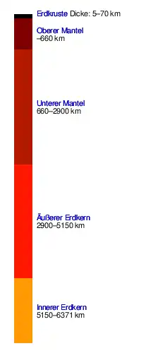 | Erdmantel | ca. 35–2900 km | 83,0 % | 67,2 % | 4,5 g/cm3 |