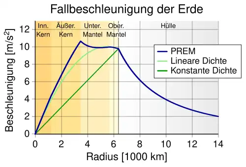 Wäre die Erde eine nicht rotierende, homogene Kugel, so ergäbe sich nach dem Newtonschen Kugelschalentheorem ein linearer Anstieg der Schwerebeschleunigung von null am Erdmittelpunkt bis zu einem Maximum an der Erdoberfläche. Tatsächlich ist die Erde aber in Schichten unterschiedlicher Dichte aufgebaut. Daher ist der Zusammenhang zwischen der Tiefe und der Erdbeschleunigung komplizierter. Im Erdkern wächst die Schwerebeschleunigung mit dem Abstand vom Erdmittelpunkt zunächst gleichmäßig an. An der Kern-Mantel-Grenze (in ca. 2900 km vom Erdmittelpunkt), nach deren Entdeckern Emil Wiechert und Beno Gutenberg auch Wiechert-Gutenberg-Diskontinuität genannt, erreicht sie ein Maximum von knapp 10,68 m/s². Dieser Effekt hat seine Ursache darin, dass der überwiegend metallische Erdkern mehr als doppelt so dicht wie der Erdmantel und die Erdkruste ist. Von dort bis zu ca. 4900 km nimmt sie zunächst wieder langsam bis auf 9,93 m/s² ab, steigt nochmals bei 5700 km auf 10,01 m/s² und sinkt dann monoton, bis sie an der Erdoberfläche etwa 9,82 m/s² erreicht.